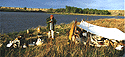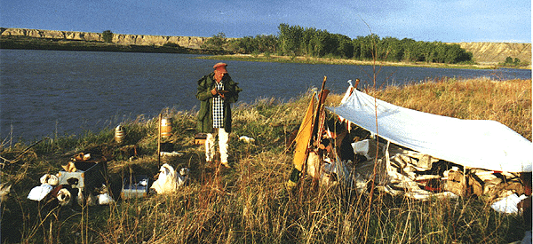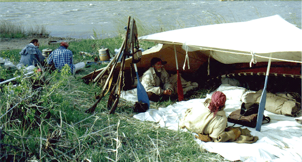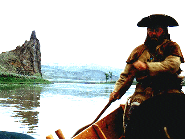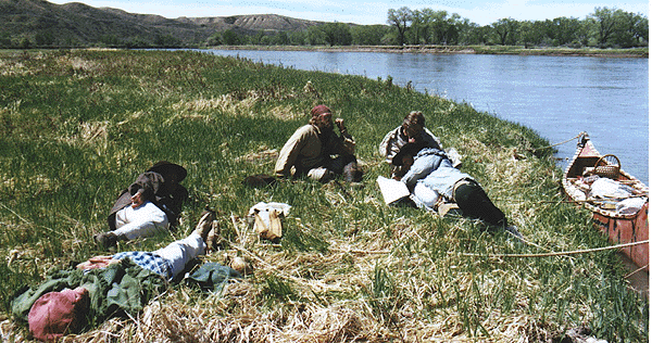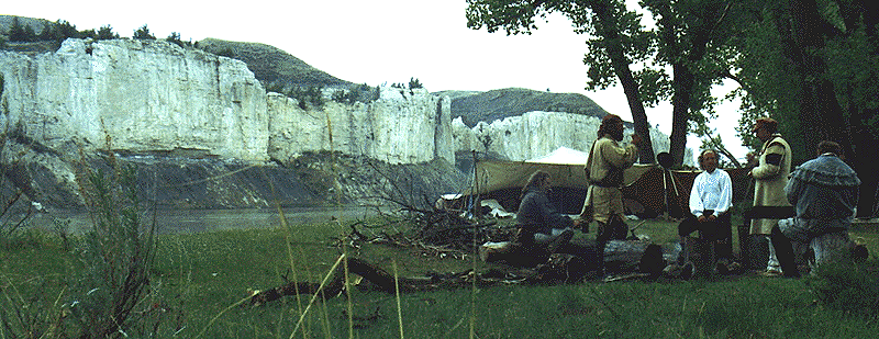 By far the most narrowest part of the voyage was the passing of "Deadman's Rapids". ((named so by the falling in, and death, of a drunkard from a steamboat. JK)) Now, with the coming of Judith Landing we beach our craft for the final time. Dan'l, much in a weakened condition, was shaking. He was entering the first stages of hypothermia. We got him into some warm clothes and put him into the truck as the rest of the men loaded the gear into the bed, and the bateau onto the trailer. After a ride back to Fort Benton our voyage of the "White Cliffs" area was at an end. However, not in the minds eye, where we shall all relive the experiences over and over again through the years -- As we, the "Brothers of The River", proceed on.This voyage was taken and completed in the historical time frame of 1808.