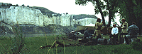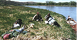After we got back he said that he wanted to lay down and rest, perhaps he would feel better after a while. I wrote in my journal and decided that I would have a look around on top of the high hills that were to the north, just above our encampment. Once there I found the remainder of our party busy in digging out an ant hill, finding some seed beads. They all pointed out to me that where we were standing was an old encampment of over 30 lodges of the Blackfeet Indians -- all along the hill to the east from where I was standing. This evidence was in the form of "lodge rings", 12 to 16 foot diameter circles of rocks, open on the east side, that were moved to provide a even and comfortable floor. The ant hill, which we were dismantling, was almost in the middle of one. I could almost feel the presence of those people, looking over the edge at the Corps of Discovery coming up river in 1805 to set camp at the river's edge at Eagle creek, or the name that Lewis gave to it, "Stone Wall Creek". It was here that Lewis and Clark, as well as the other men who could write, gave the most poetic lines of the voyage.